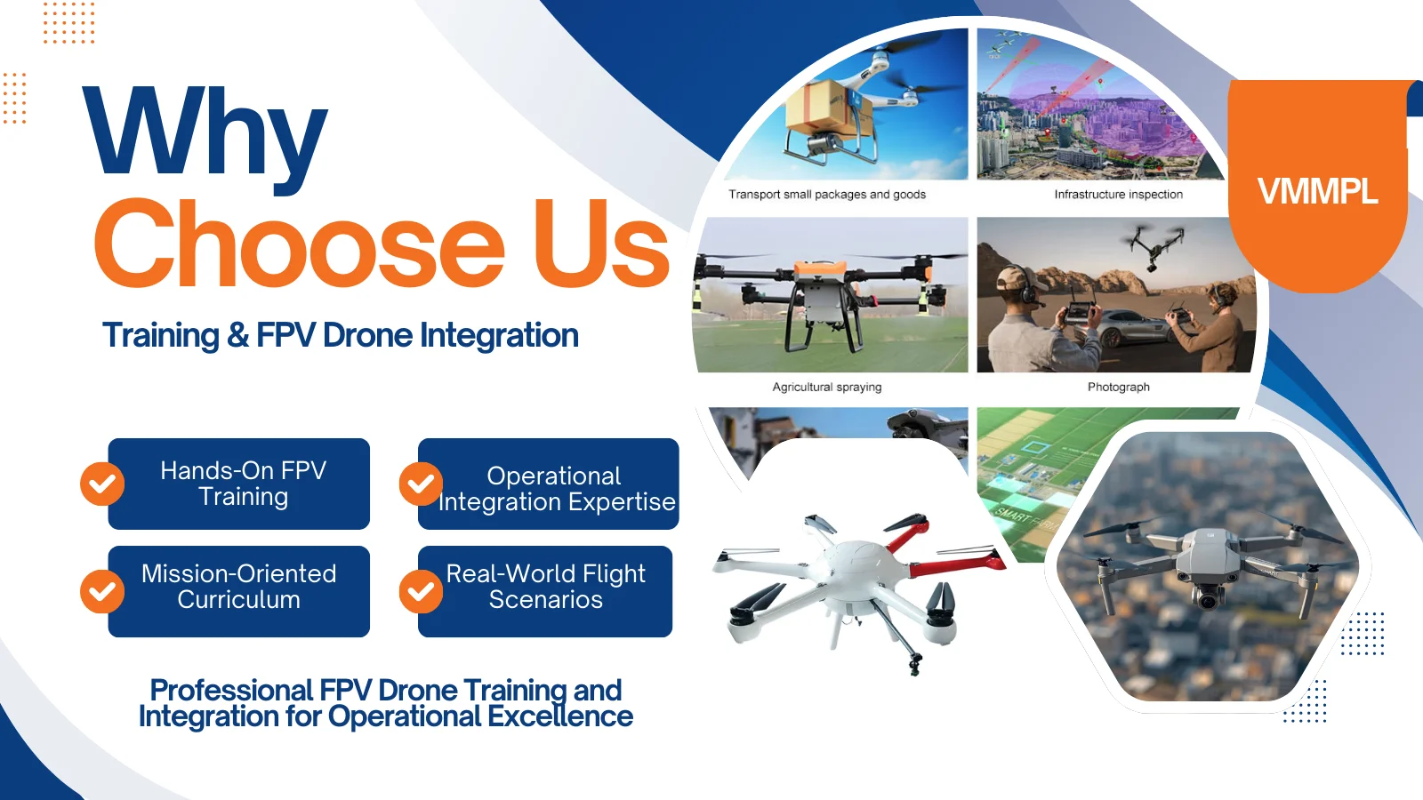 We provide end-to-end Training & FPV Drone Integration Solutions, designed to enhance pilot competency, mission efficiency, system reliability, operational safety, and scalable drone deployment capability across diverse sectors.